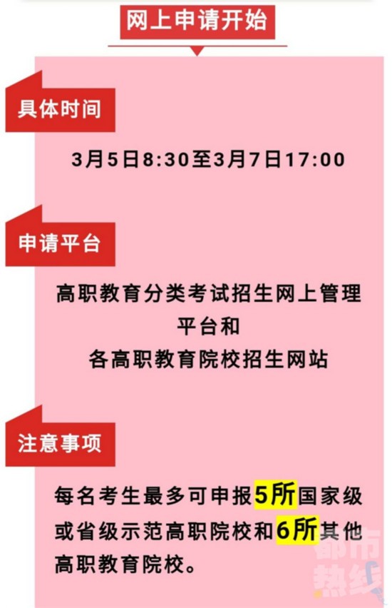 高職分類考試招生是陜西省高考統(tǒng)考外,另外一種高考招生模式。最大的特點就是考生完成測試考核后,不用參加6月7號8號兩天的高考統(tǒng)考,就能獲得我省高職院校的錄取資格。根據(jù)日程安排,3月5日至7日,已經(jīng)報名參加我省高考的統(tǒng)考生和職高技校中專生,都可以在網(wǎng)上提出入學申請。