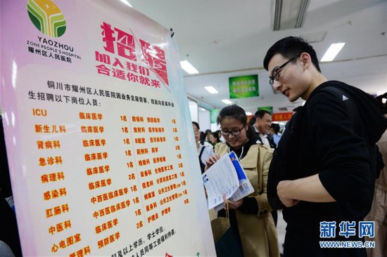 4月1日,學(xué)生在招聘會上了解銅川市耀州區(qū)人民醫(yī)院招聘情況。當(dāng)日,陜西省2018年縣及縣以下醫(yī)療衛(wèi)生機構(gòu)定向招聘醫(yī)學(xué)類本科畢業(yè)生專場招聘會在陜西省人才交流服務(wù)中心舉行,現(xiàn)場提供崗位2415個,涉及臨床醫(yī)學(xué)、預(yù)防醫(yī)學(xué)、口腔醫(yī)學(xué)、醫(yī)學(xué)影像等專業(yè)。新華社記者李一博攝xuS安康新聞網(wǎng)