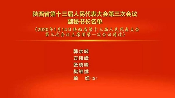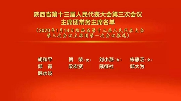 會議以按表決器方式,推選出由胡和平、賀榮、劉小燕、朱靜芝、郭青、梁宏賢、戴征社、郭大為、韓水岐組成的主席團常務(wù)主席;決定了會議日程;決定了大會執(zhí)行主席分組名單;決定韓水岐、方瑋峰、張曉峰、樊維斌、單紅擔(dān)任大會副秘書長。