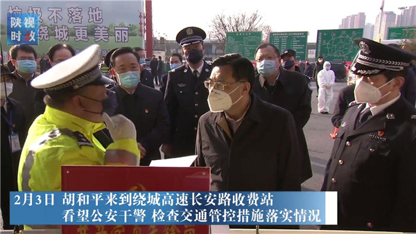 胡和平來(lái)到繞城高速長(zhǎng)安路收費(fèi)站,看望公安干警,檢查交通管控措施落實(shí)情況,并來(lái)到西安市鄠邑區(qū)五竹街道五竹村檢查疫情排查防控工作。
