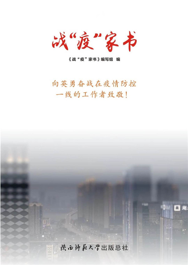 陜西師大出版總社積極響應(yīng)、主動作為,全國首推《戰(zhàn)“疫”家書》一書,用文字和圖片生動記錄了一封封戰(zhàn)“疫”家書,講述抗疫一線的感人事跡,訴說著“白衣戰(zhàn)士”等平凡英雄內(nèi)心深處的真情與大愛。微信短信,手機(jī)里有字里行間的情感流露,見字如面,紙短情長。家書中,有難舍的牽掛,有家人的囑托,有醫(yī)務(wù)工作者“健康所系,性命相托”的莊嚴(yán)承諾,更有用無比的勇氣和斗志奔赴抗疫戰(zhàn)場的家國情懷。
