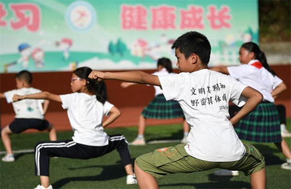 7月9日,在陜西省安康市平利縣老縣鎮(zhèn)中心小學(xué)的操場上,學(xué)生們在課后參加武術(shù)社團(tuán)活動。新華社記者李一博 攝