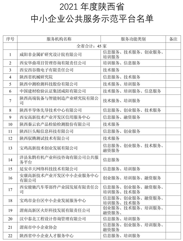 一、授予咸陽非金屬礦研究設(shè)計院有限公司等45家平臺“陜西省中小企業(yè)公共服務(wù)示范平臺”稱號。省級示范平臺認(rèn)定有效期三年。