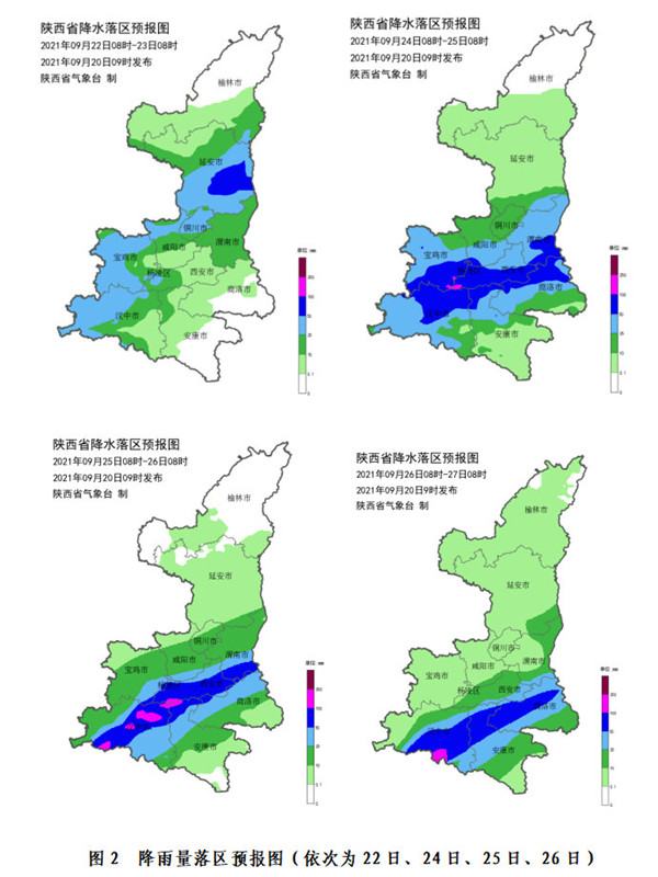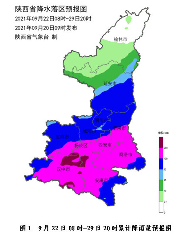 受副高外圍暖濕氣流和高空槽共同影響,22日白天起我省將開始新一輪持續(xù)性陰雨天氣,預計將維持至月底。過程期間有3個以上暴雨日,其中22日強降水主要位于陜北南部、關中西部、陜南西部,以大到暴雨為主;24-26日強降水主要位于關中、陜南地區(qū),部分地區(qū)有暴雨,不排除局地出現大暴雨的可能性;27日至月底強降水主要位于陜南地區(qū)。過程累計降水量:陜北中北部5~40毫米;延安南部、關中北部60~80毫米,局地可達100毫米以上;關中南部、陜南大部100~200毫米,局地可達200~300毫米(圖1)。降水前期間具有對流性質,預計局地最大小時雨強20~40毫米。