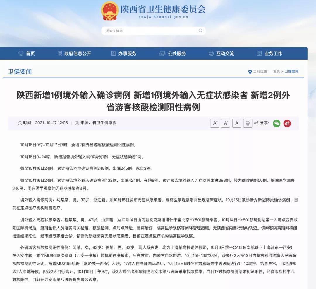陜西衛(wèi)健委剛剛通報(bào):10月16日0時-10月17日7時,新增2例外省游客核酸檢測陽性病例。