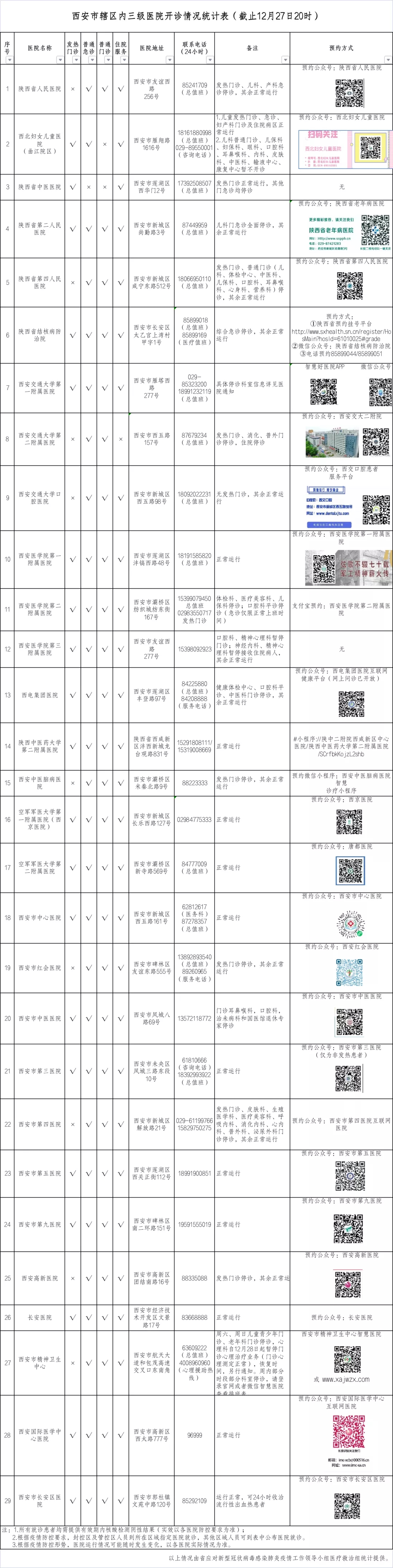 截止12月27日20時(shí),西安市轄區(qū)內(nèi)三級(jí)醫(yī)院開診情況,具體戳下圖了解↓↓↓