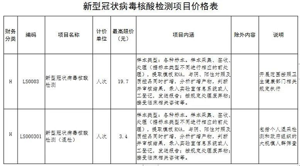 一、公立醫(yī)療機構按照衛(wèi)生健康部門診療規(guī)范開展的新型冠狀病毒核酸檢測單人單檢價格每人次最高限價為19.7元(含擴增試劑);多人混檢不分樣本數量,每人次最高限價為3.4元。