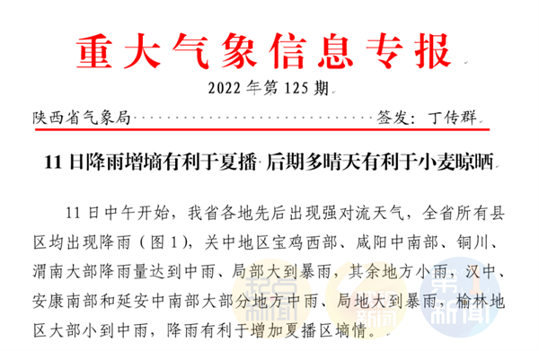6月12日13時(shí),陜西省氣象臺(tái)發(fā)布重大氣象信息專(zhuān)報(bào)。