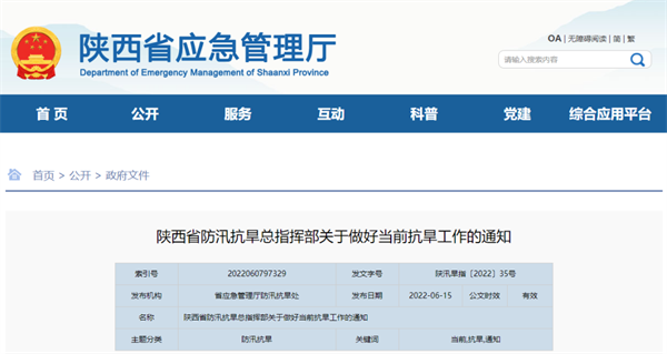 近期我省降水偏少,氣溫持續(xù)偏高,導(dǎo)致陜北北部、陜南東部、渭北出現(xiàn)輕到中度干旱,其中榆林、商洛、渭北局地出現(xiàn)嚴重干旱。后期降水仍將分布不均,旱情發(fā)展演變升級快,影響到工農(nóng)業(yè)生產(chǎn)安全。為做好當(dāng)前抗旱工作,現(xiàn)就有關(guān)要求通知如下: