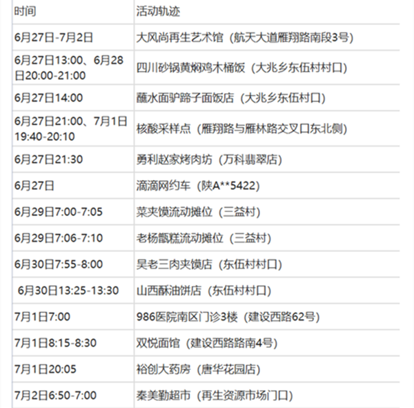 7月2日0-18時(shí),西安市新增1例本土確診病例,系重點(diǎn)人群核酸篩查中發(fā)現(xiàn)。6月19日、21日、24日、28日核酸檢測(cè)結(jié)果均為陰性,7月2日7時(shí)40分混檢結(jié)果異常,7月2日13時(shí),西安市疾病預(yù)防控制中心單檢結(jié)果陽(yáng)性,經(jīng)市級(jí)專(zhuān)家組診斷為確診病例(輕型),主要活動(dòng)軌跡如下:au7安康新聞網(wǎng)