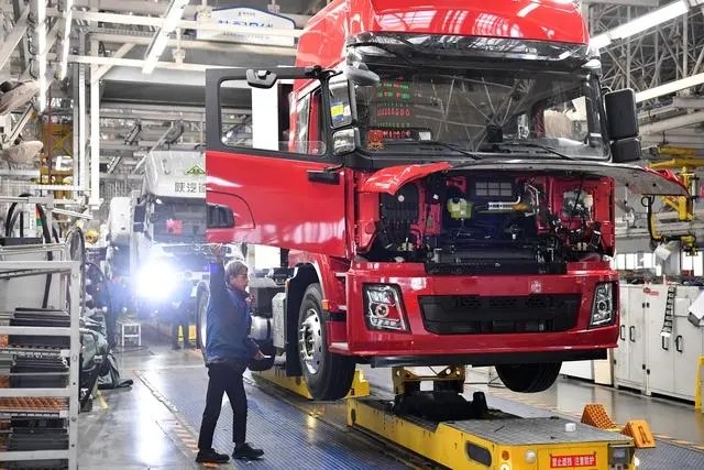 工業(yè)機器人揮舞長臂,工人在生產線上緊張忙碌。在位于西安經開區(qū)涇渭新城的陜汽控股集團,總裝車間正馬力全開,每6分鐘就有一輛整車從這里下線。