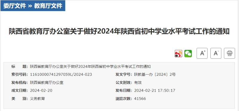 2月21日記者從陜西省教育廳獲悉,2024年陜西省初中學(xué)業(yè)水平考試工作相關(guān)安排出爐,對(duì)考試對(duì)象、考試科目、各科目試卷滿分值及考試時(shí)長(zhǎng)等做了明確。突出學(xué)生綜合素質(zhì)的考查,并通過優(yōu)化命題形式,引導(dǎo)減少死記硬背和“機(jī)械刷題”。任何單位與個(gè)人不得根據(jù)初中學(xué)業(yè)水平考試成績(jī)給學(xué)校和學(xué)生排隊(duì)或以任何形式公布名次。