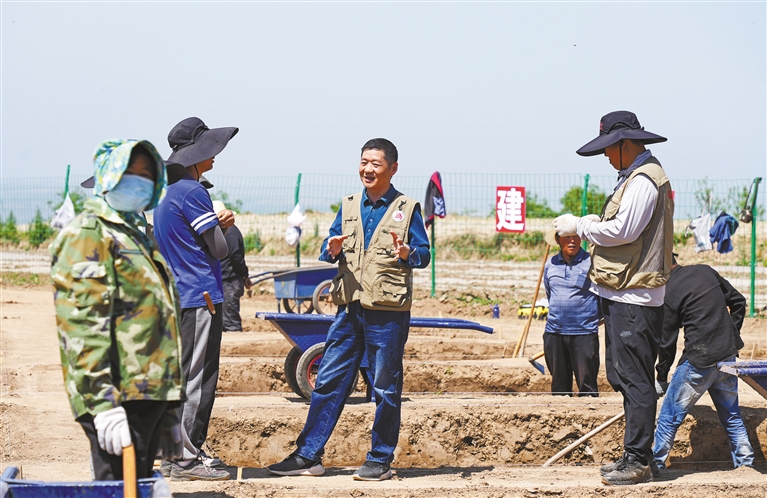4月26日,錢(qián)耀鵬(左三)在陜西旬邑西頭遺址與工作人員交流。 記者 王熙攝