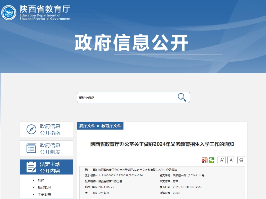 陜西省教育廳辦公室關(guān)于做好2024年義務(wù)教育招生入學工作的通知