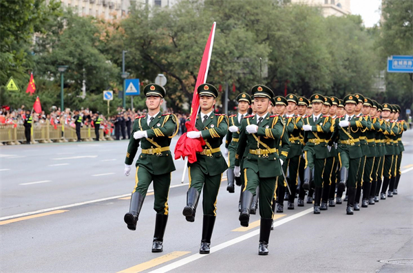 國(guó)旗護(hù)衛(wèi)隊(duì)隊(duì)員邁著鏗鏘有力的步伐,護(hù)送國(guó)旗至升旗臺(tái)。