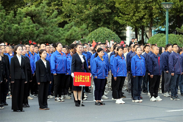 企業(yè)職工代表參加升國(guó)旗儀式。