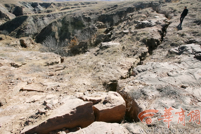 神木縣中雞鎮(zhèn)煤礦采空區(qū)地質(zhì)坍陷造成的裂縫長(zhǎng)達(dá)數(shù)公里,因?yàn)榈叵滤魇,地表草木苦干。本?bào)記者 鄧小衛(wèi) 文/圖