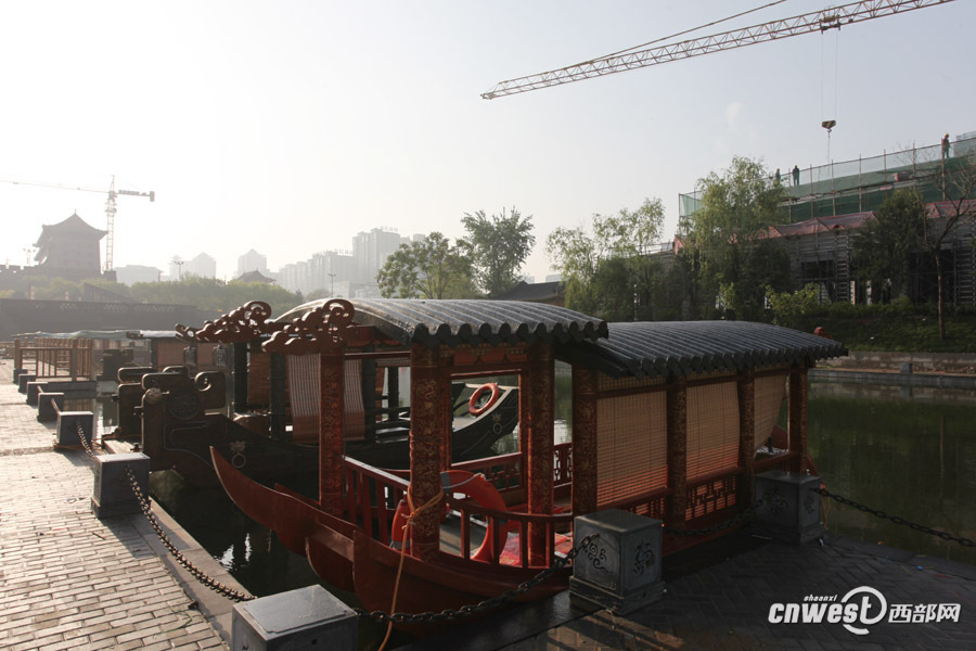 城墻南門西側(cè)護城河上停泊著7艘秦、漢、唐不同主題的仿古游船。