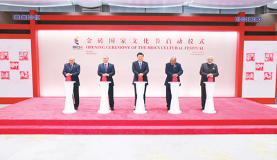 同日,金磚國家領(lǐng)導(dǎo)人共同出席金磚國家文化節(jié)啟動儀式暨文化圖片展。習(xí)近平和其他金磚國家領(lǐng)導(dǎo)人在各國印章柱上按下印章,對面屏幕上同時顯示出金磚國家中文國名篆刻印文,共同啟動文化節(jié)開幕式。隨后,五國領(lǐng)導(dǎo)人共同參觀金磚國家文化圖片展,并觀看金磚國家首部合拍影片《時間去哪兒了》片花。