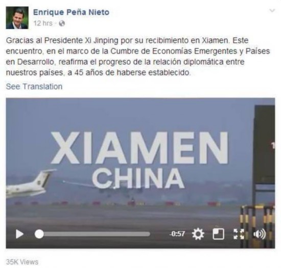 墨西哥總統(tǒng)培尼亞參加了5日召開的新興市場(chǎng)國(guó)家與發(fā)展中國(guó)家對(duì)話會(huì),商討“金磚+”合作。他在臉譜賬號(hào)上發(fā)文說:“感謝習(xí)近平主席在廈門的款待。在新興市場(chǎng)國(guó)家與發(fā)展中國(guó)家對(duì)話會(huì)期間(與習(xí)主席)的會(huì)晤,在(墨中)建交45周年之際,加深了我們兩國(guó)之間的外交關(guān)系!