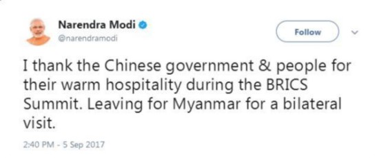 廈門會(huì)晤期間,印度總理莫迪關(guān)于“金磚”發(fā)了至少15條推文。會(huì)晤一結(jié)束,莫迪連發(fā)6條推文,介紹參會(huì)成果,其中3條是這么說的: