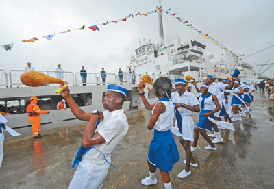 這是和平方舟醫(yī)院船首次訪問莫桑比克。莫方在碼頭舉行了歡迎儀式,莫海軍、國防部官員以及中國駐莫大使館工作人員,中資機構、華僑華人代表等500余人迎接,當地民眾跳起民族舞蹈表示歡迎。