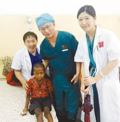 楊鐵軍這次到達(dá)幾內(nèi)亞后實施手術(shù)的第一例患者是一名6歲兒童。這位兒童遭遇了車禍,傷勢嚴(yán)重,右上肢和下肢都有骨折、右股骨粉碎性骨折。小患者已經(jīng)住了很久醫(yī)院,但是當(dāng)?shù)卮蠓虿恢廊绾谓o這個孩子治療,只能暫時用石膏固定病肢。在楊大夫給小患者成功手術(shù)后僅兩周,小患者右上肢石膏已拆除,活動自如。孩子父母對中國醫(yī)療隊的感激溢于言表,孩子天真稚氣的小臉上又重現(xiàn)了往日的歡樂笑容。
