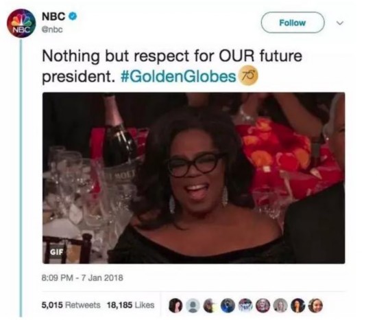 不過(guò)這則推文引發(fā)了大量爭(zhēng)議,NBC之后將其刪除,并解釋稱“只是借用頒獎(jiǎng)禮現(xiàn)場(chǎng)的玩笑,并非政治聲明”,但還是不難看出媒體及民眾對(duì)奧普拉的諸多期待。