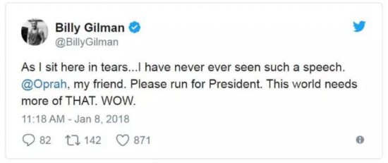 Billy Gilman:我現(xiàn)在坐在這兒淚流滿面……我從來(lái)沒聽過(guò)這樣的演講,奧普拉,我的朋友,請(qǐng)競(jìng)選總統(tǒng)吧,這個(gè)世界需要更多這樣的聲音。