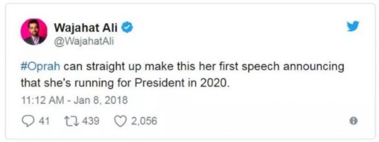 Wajahat Ali:奧普拉可以直接把這次演講當(dāng)做宣布參選2020年總統(tǒng)競(jìng)選的演講。