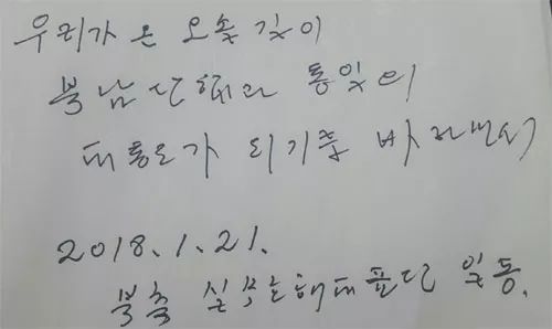 21日,朝鮮三池淵管弦樂團團長玄松月一行前往韓國,為朝鮮藝術(shù)團冬奧會期間赴韓演出提前“踩點”。當晚朝方人員用過晚餐后,玄松月在酒店留言簿寫了一句話:“希望我們走過的羊腸小道,可以成為北南團結(jié)和統(tǒng)一的大路”。署名為“朝方實務了解代表團全體”。雖然內(nèi)容簡短,卻引發(fā)了韓國輿論的猜測。