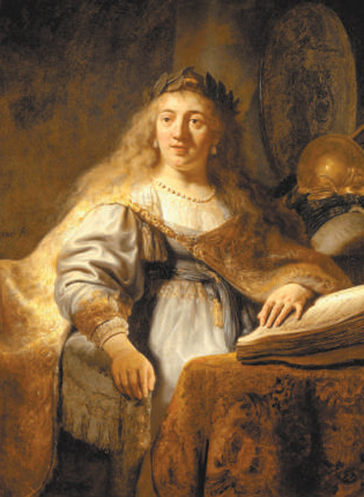 在《穿金邊斗篷的少女》這幅作品中,為了凸顯對(duì)明暗光影效果的處理能力,畫中人身著黑色斗篷,連同灰黑的背景,大面積的暗部將作為重點(diǎn)的人物面部烘托出來(lái),宛若聚光式的映照,透過(guò)少女面部精致的五官,觀眾仿佛感受到了正款款流出的情思。在倫勃朗筆下,美不再僅僅是對(duì)漂亮容顏的寫真,光影之間,鮮活的人物個(gè)性塑造才是其孜孜以求的關(guān)鍵,成為最打動(dòng)人心的地方,畫布里充滿被欣賞的氣氛。而他少有的歷史畫作,也無(wú)不彰顯其過(guò)人的天資。在《書房中的女神密涅瓦》中,老到而精煉的技法、逼真的物象處理、和諧的光影關(guān)系等,很難讓人相信這幅巨作出自年僅29歲的倫勃朗之手。