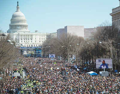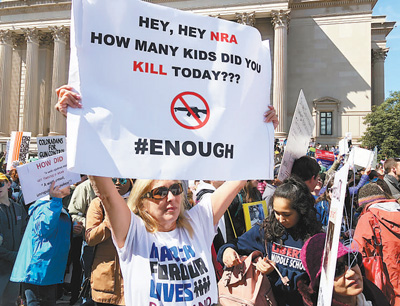 3月24日,來自全美各地的近50萬人涌入美國首都華盛頓,參加以“為了我們的生命”為主題的反對槍支暴力大游行。游行者呼吁美國政府采取更加嚴格的控槍措施,保護校園安全,同時要求政客們不再接受美國全國步槍協(xié)會等團體的政治獻金。這一天,從紐約、波士頓、洛杉磯,再到上月發(fā)生校園槍擊案的佛羅里達州帕克蘭,同一主題的大游行在全美390多個城市同步舉行。美國民眾尤其是青少年學(xué)生紛紛走上街頭,響亮地發(fā)出他們的聲音:“面對槍支暴力,我們不再沉默,政客們必須在控槍問題上有所作為。”