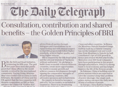 人民網(wǎng)訊 據(jù)外交部網(wǎng)站報道,2018年3月26日,英國主流大報《每日電訊報》紙質(zhì)版和網(wǎng)絡版同時刊登駐英國大使劉曉明題為《共商共建共享是“一帶一路”的“黃金法則”》的署名文章。全文如下:
