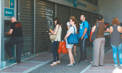 | 希臘債務(wù)危機(jī)于2015年大選后急劇惡化,引發(fā)國內(nèi)擠兌“狂潮”。圖為2015年7月2日,雅典民眾在取款機(jī)前排隊(duì)取錢。 |