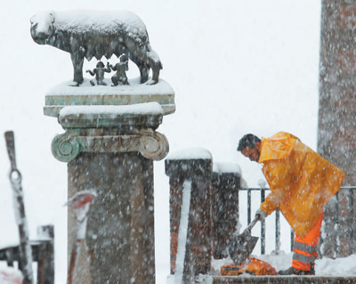 | 由于當(dāng)?shù)卣姓书L期低下難解,經(jīng)常讓意大利首都羅馬等地因大雪等突發(fā)狀況陷入“癱瘓”。圖為2018年2月26日,一名清潔工在羅馬市政府外清除積雪。 |