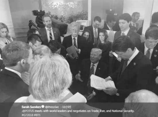 英國(guó)媒體解讀稱,這張照片凸顯了G7峰會(huì)氣氛的劍拔弩張。特朗普與其他6國(guó)領(lǐng)導(dǎo)人就貿(mào)易、氣候變化、伊朗核協(xié)議分歧仍然顯著,難以彌合。