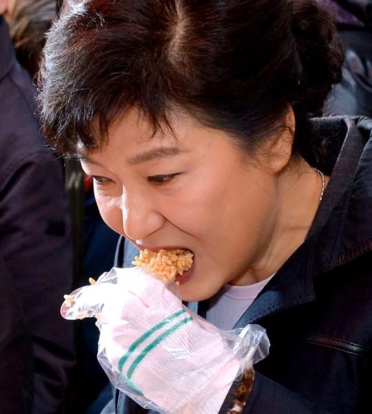 2012年11月,總統(tǒng)候選人樸槿惠現(xiàn)身傳統(tǒng)市場(chǎng),購(gòu)買糕點(diǎn)并品嘗。