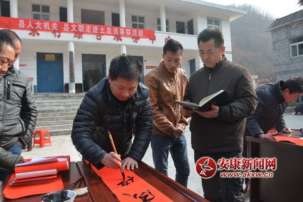 1月19日,白河縣人大、縣文聯(lián)組織縣內(nèi)十名書法家走進(jìn)西營(yíng)鎮(zhèn)土泉村,為精準(zhǔn)扶貧村民現(xiàn)場(chǎng)書寫春聯(lián),送去新春祝福。