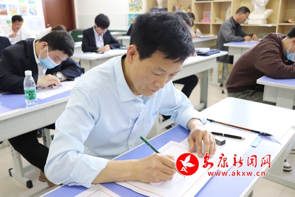 活動中,參賽選手在規(guī)定時間內(nèi),完成鋼筆字、粉筆字、毛筆字和簡筆畫創(chuàng)作。黨員教師鋼筆字和粉筆字書寫入黨誓詞,進一步錘煉了黨性,重溫了初心,堅定了不忘初心跟黨走的信心。非黨員教師硬筆書寫《清平樂·六盤山》,在感受偉人宏大氣概和紅軍北上抗日堅強意志的同時,激發(fā)了大家為黨育人、為國育才的不竭動力。整個比賽過程,選手們潑墨揮毫、激烈角逐,憑借著過硬的專業(yè)技能和深厚的文化素養(yǎng),在短短40分鐘內(nèi),將一幅幅規(guī)范、簡潔的書畫作品呈現(xiàn)在大家眼前。毛筆字或氣勢磅礴或剛?cè)岵讳摴P字或筆順流暢或秀氣雋美;粉筆字或清新端正或大方得體;簡筆畫或勾勒簡潔或陽光活力,充分展現(xiàn)了安康高新區(qū)教師扎實的教學(xué)基本功。