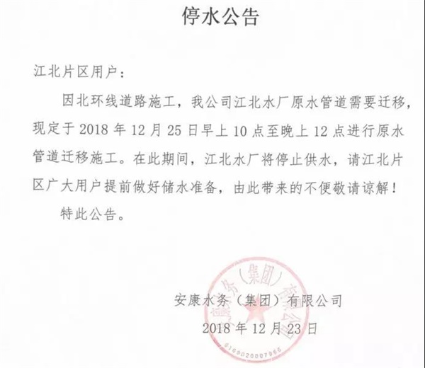 因北環(huán)線道路施工,安康水務(集團)有限公司江北水廠原水管道需要遷移,現(xiàn)定于2018年12月25日上午10時至晚上12時進行原水管道遷移施工。在此期間,江北水廠將停止供水,請江北片區(qū)廣大用戶提前做好儲水準備,由此帶來的不便敬請諒解!