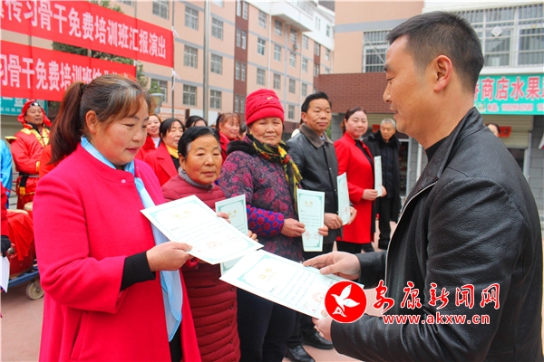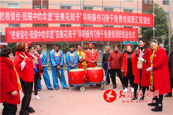 安康新聞網(wǎng)訊(通訊員 周濤 胡德良)12月23日,“把根留住•我眼中的非遺”“安康花鼓子”早陽(yáng)鎮(zhèn)傳習(xí)骨干免費(fèi)培訓(xùn)匯報(bào)演出暨結(jié)業(yè)儀式在漢濱區(qū)早陽(yáng)鎮(zhèn)共進(jìn)社區(qū)舉行, 22名學(xué)員通過(guò)嚴(yán)格考核后順利結(jié)業(yè),這也是漢濱區(qū)文化館、漢濱區(qū)非物質(zhì)文化遺產(chǎn)保護(hù)中心首次將省級(jí)非物質(zhì)文化遺產(chǎn)保護(hù)項(xiàng)目——“安康花鼓子”免費(fèi)培訓(xùn)延伸到鄉(xiāng)鎮(zhèn)。