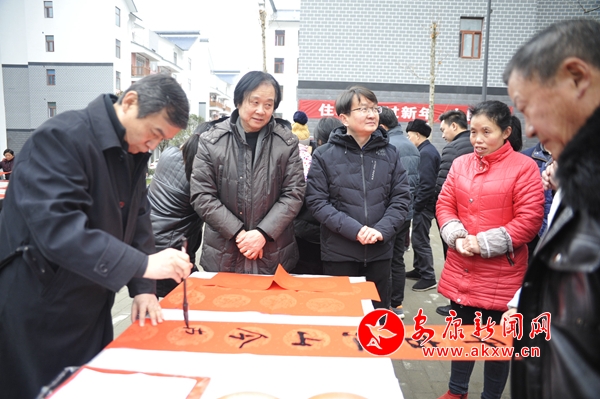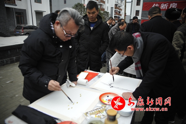 座談結(jié)束后,郭線廬一行在該鎮(zhèn)社區(qū)廣場開展了春聯(lián)義寫活動,F(xiàn)場創(chuàng)作書畫作品免費贈予群眾,來自省、市、區(qū)的書畫家們飽含激情,現(xiàn)場揮毫潑墨,把一個個“福”字、一副副對聯(lián)、一張張精心創(chuàng)作的書畫作品送到群眾的手中,受到了周邊群眾的歡迎。