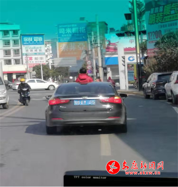 本網(wǎng)訊(通訊員 唐波)2月11日,有網(wǎng)友舉報,一輛小轎車在行駛過程中,駕駛?cè)朔湃诬囍泻⒆影杨^探出天窗觀賞風(fēng)景,非常危險。