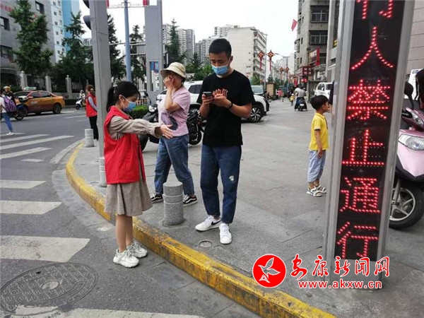 “你好,請走人行道”“綠燈亮了,再過斑馬線”……戴著口罩,統(tǒng)一身穿紅色馬甲的文明勸導員,在十字路口溫馨地對過往行人勸導著。