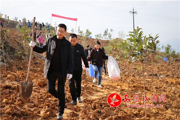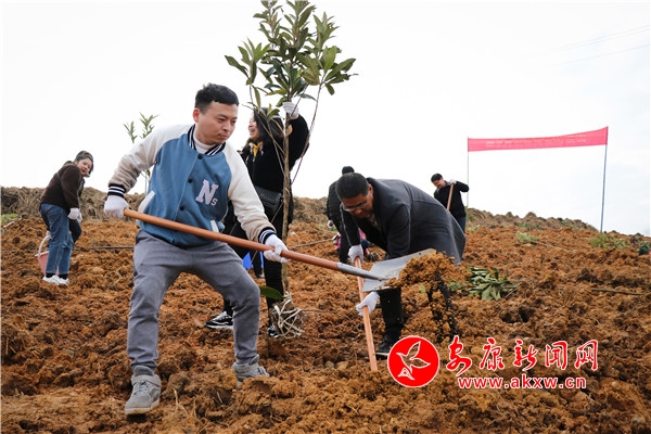 在植樹現(xiàn)場,大伙兒分工協(xié)作,揮鍬鏟土、填入樹坑、夯土壓實、提桶澆水,一派熱火朝天的勞動景象。經(jīng)過兩個小時的悉心栽植,52株枇杷樹苗迎風(fēng)挺立在黃土坡上,待到枝繁葉茂時,必將結(jié)下累累果實。