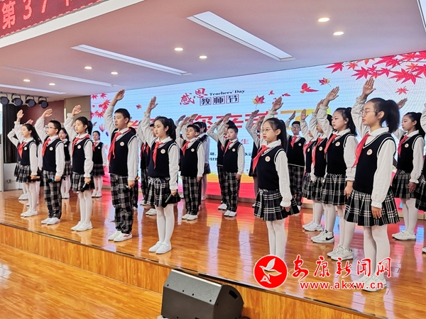 “薄霧朦朧,當(dāng)天空染上第一縷朝霞,您的身影已出現(xiàn)在校園……”來自果園小學(xué)六年級二班的少先隊員激情朗誦《致敬愛的老師》,深情謳歌教師的無私大愛,拉開了教師節(jié)慶祝大會的序幕。