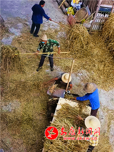 6月6日,驕陽似火。漢濱區(qū)赤衛(wèi)村周全洪一家忙得不亦樂乎,他戴著草帽和口罩,將麥穗一把一把喂進脫粒機,幫忙的鄰居們或抱捆持簸或木叉飛揚,妻子不停地晃動手中竹篩,金燦燦的麥粒散落成堆,女兒夢蝶一邊端茶水遞毛巾,一邊用手機直播:“這是陜南農村傳統的打麥子方式。”“形象很酷,動作很帥……是不是?”“要吃富硒新麥子,可以呀!”益農的“新農具”,帶貨又漲粉。