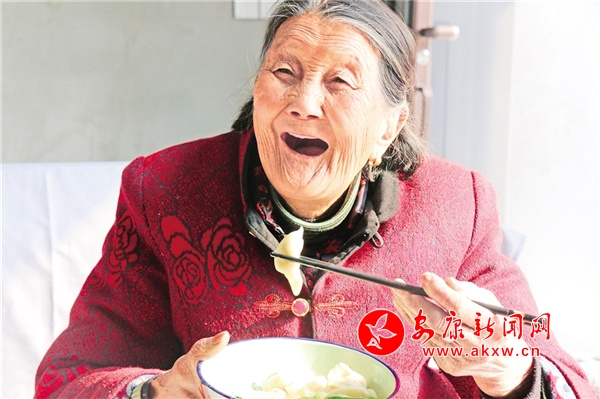 李增富前腳剛進(jìn)門,我們也隨著他走進(jìn)屋,接過兒子遞過來的飯碗,母親一口一口慢慢吃著餃子,“這餃子香,我一次能吃十幾個(gè)呢。”雖然耳朵聽不清,但是老人對(duì)食堂的飯菜贊賞有加。