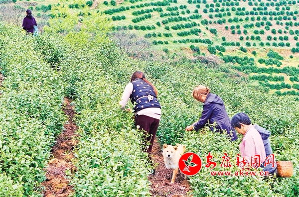 △ 茶農在漢濱區(qū)瀛湖鎮(zhèn)火星村茶葉示范園采摘新茶